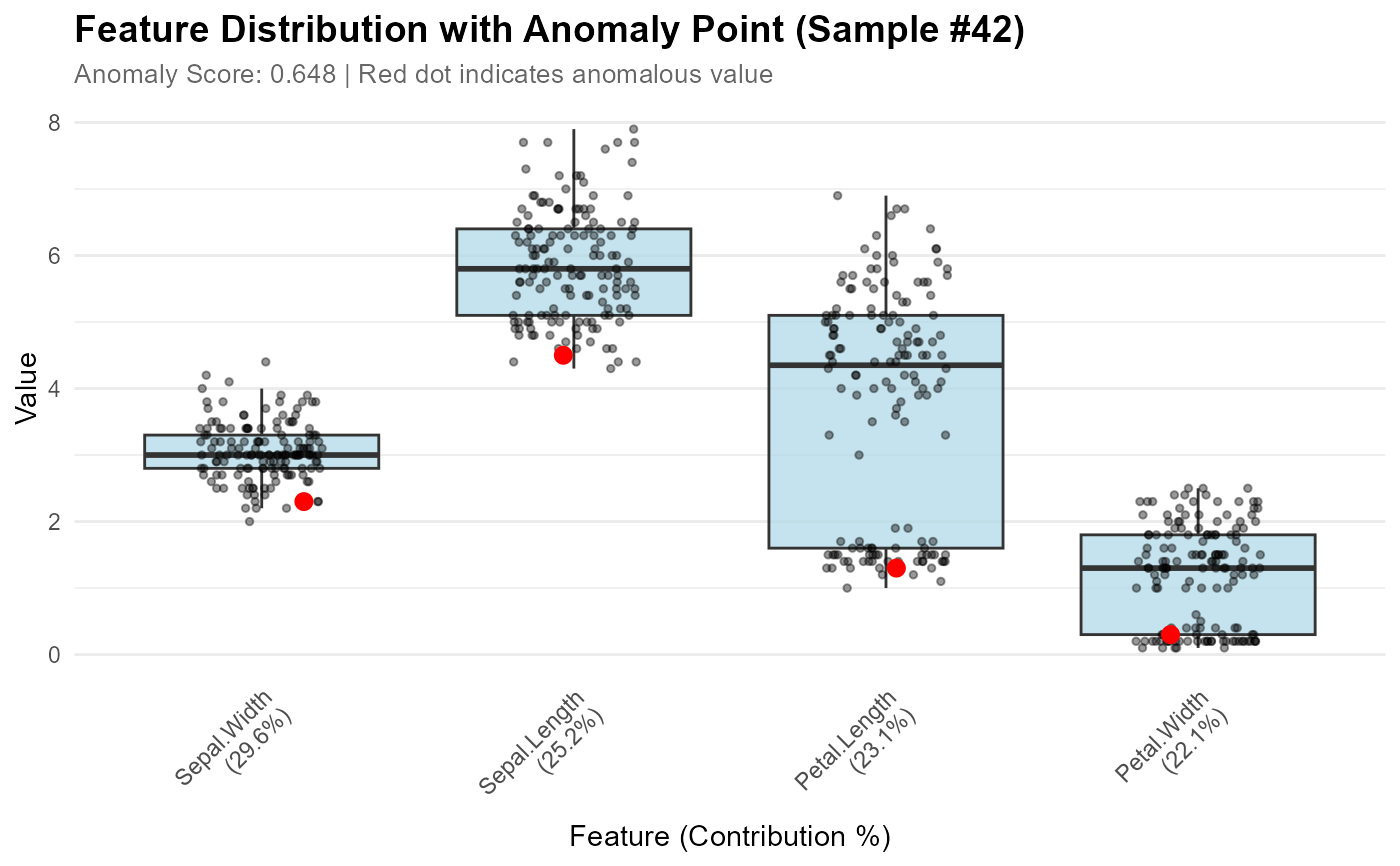 Create boxplots showing how anomalous points compare to the overall feature distributions. All data points are shown as small black dots, with the anomalous point(s) highlighted in red (or custom color) for easy identification. Can work with or without a contribution object.