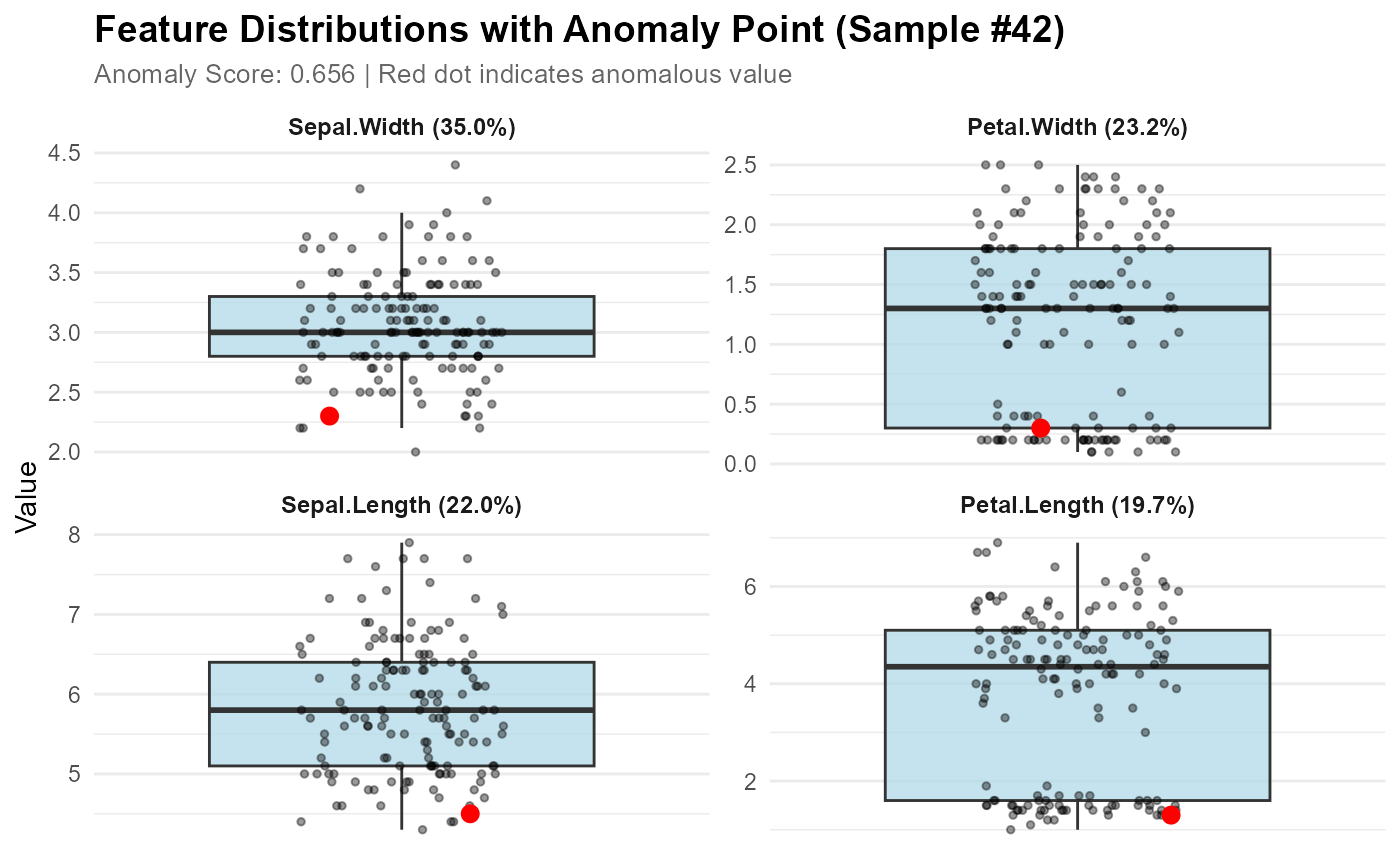 plot_anomaly_boxplot_faceted(contributions, iris[1:4], sample_id = 42)